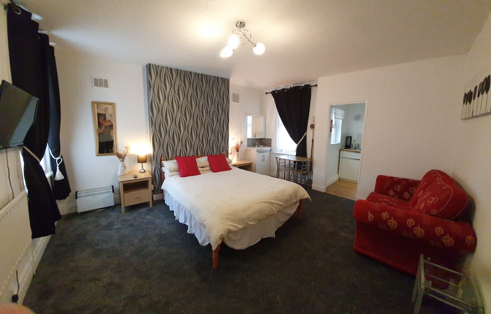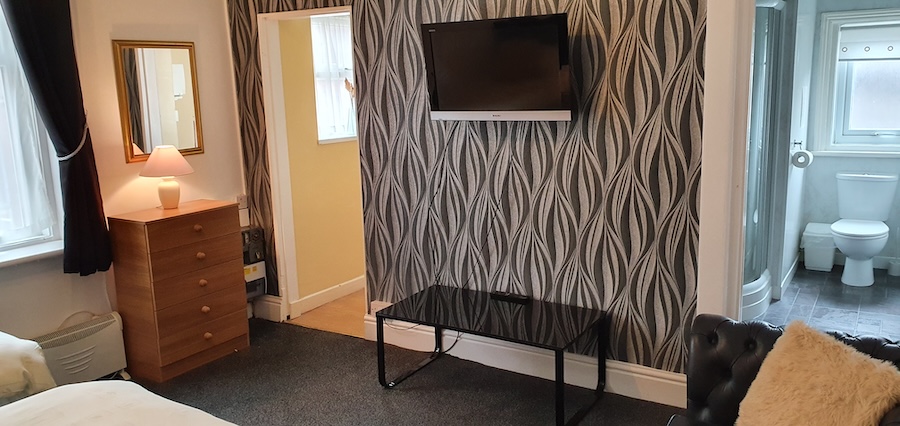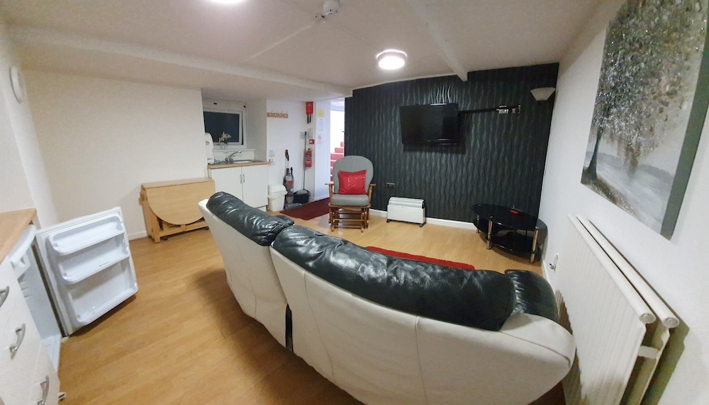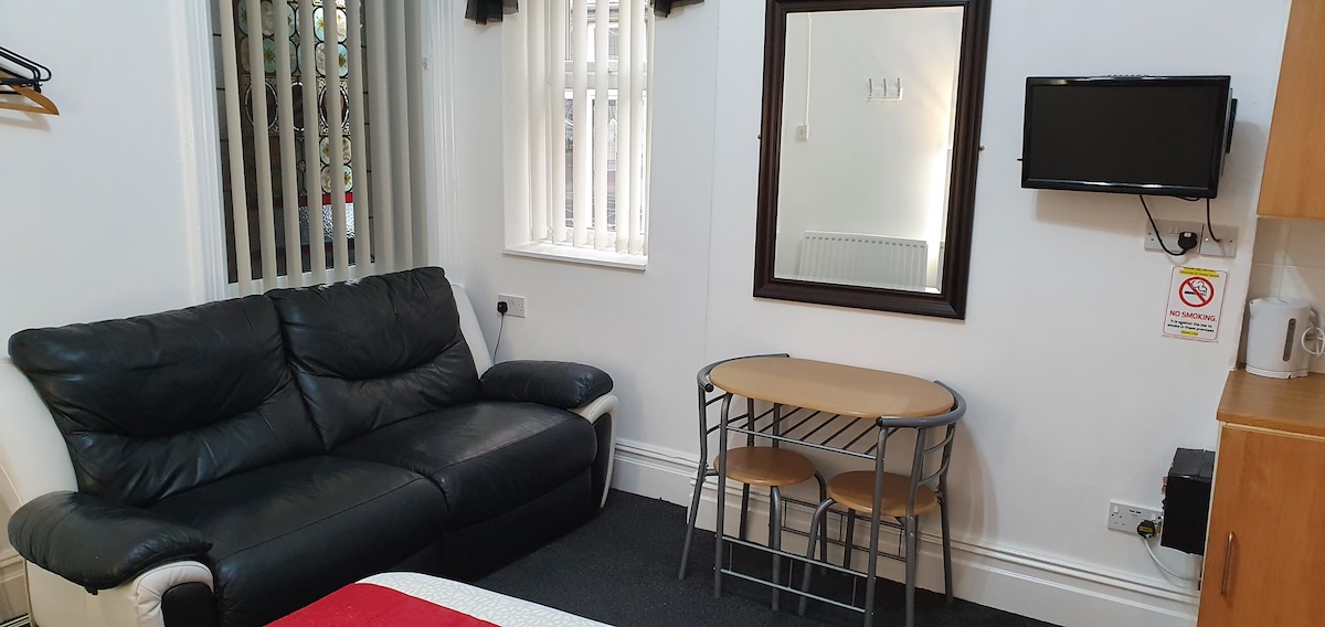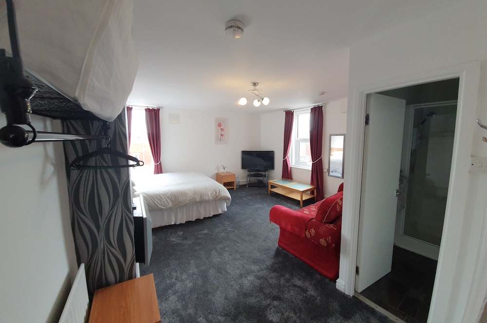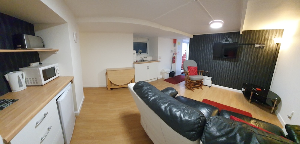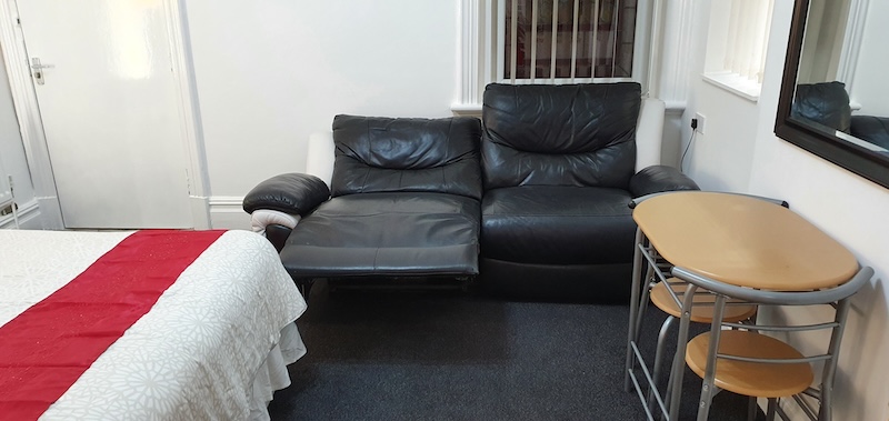 Front flat – Spacious lounge with sofa, TV, bed, Separate dining/kitchen, Own shower and toilet.