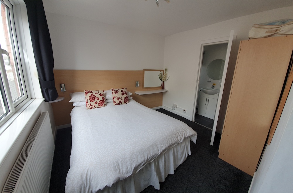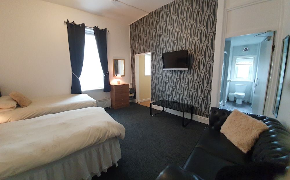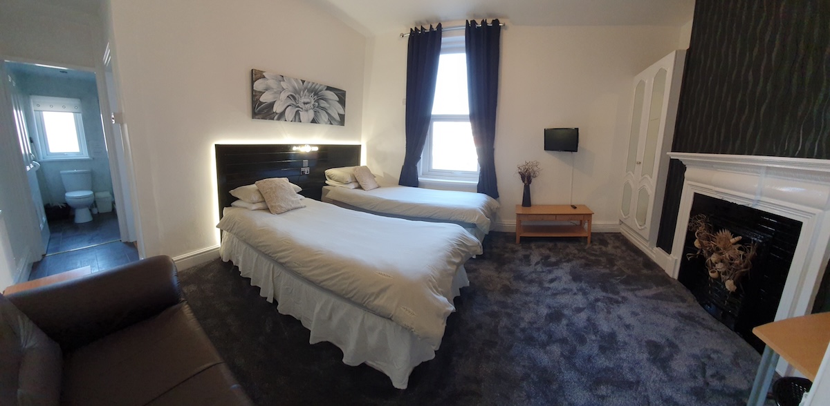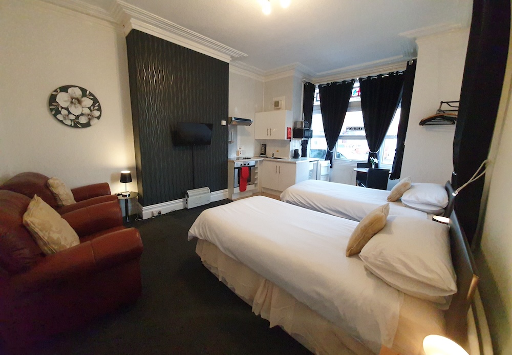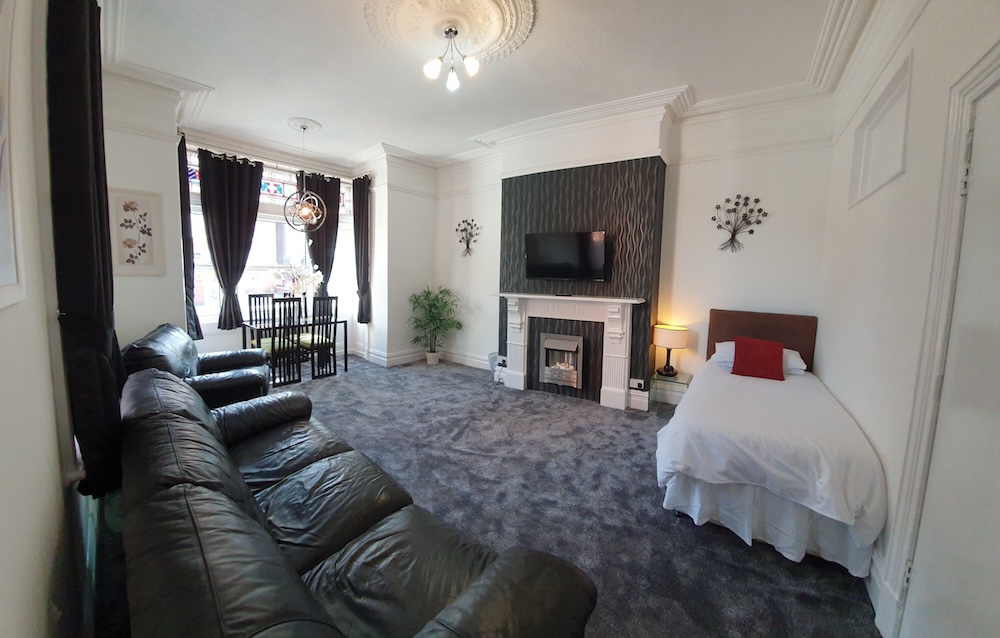 Front flat – Spacious lounge with sofa, TV, bed, Separate dining/kitchen, Own shower and toilet.