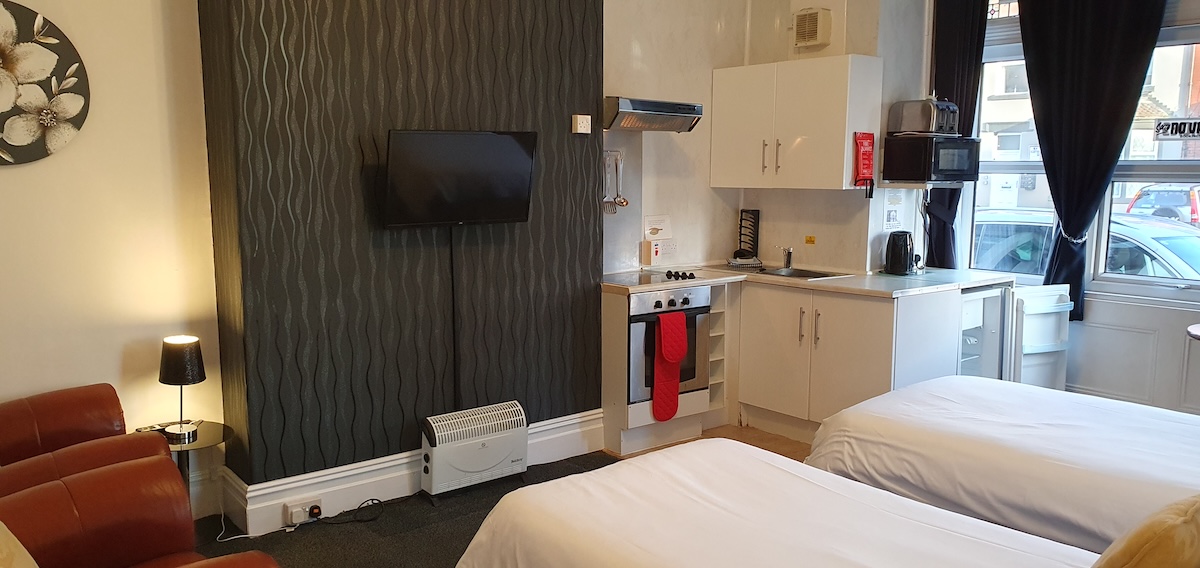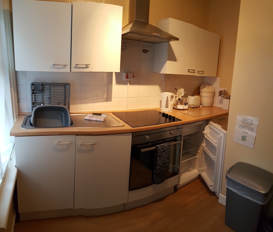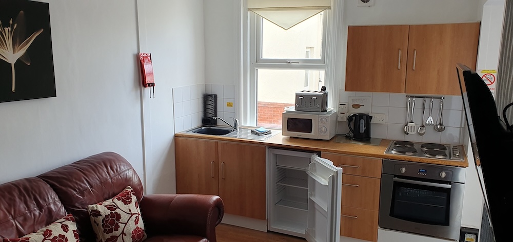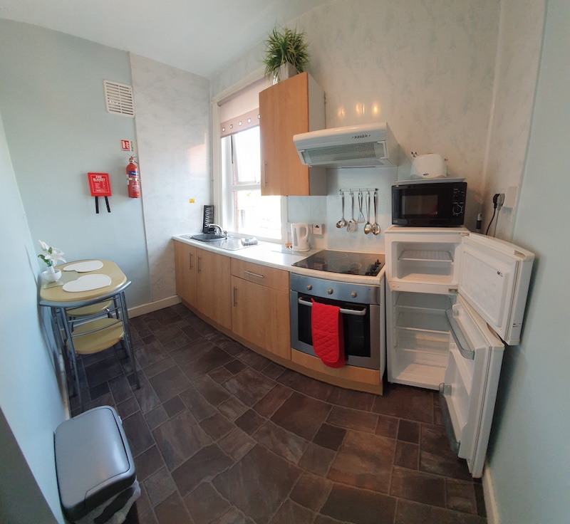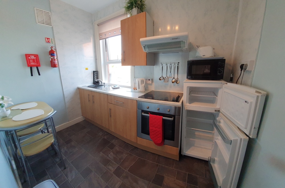 These modern apartments are fitted with Electric Cookers, Kettles, Toasters, Ironing Facilities, Microwaves, Electric Fires, Fridges and Free view Television, They are completely furnished and tastefully decorated.
